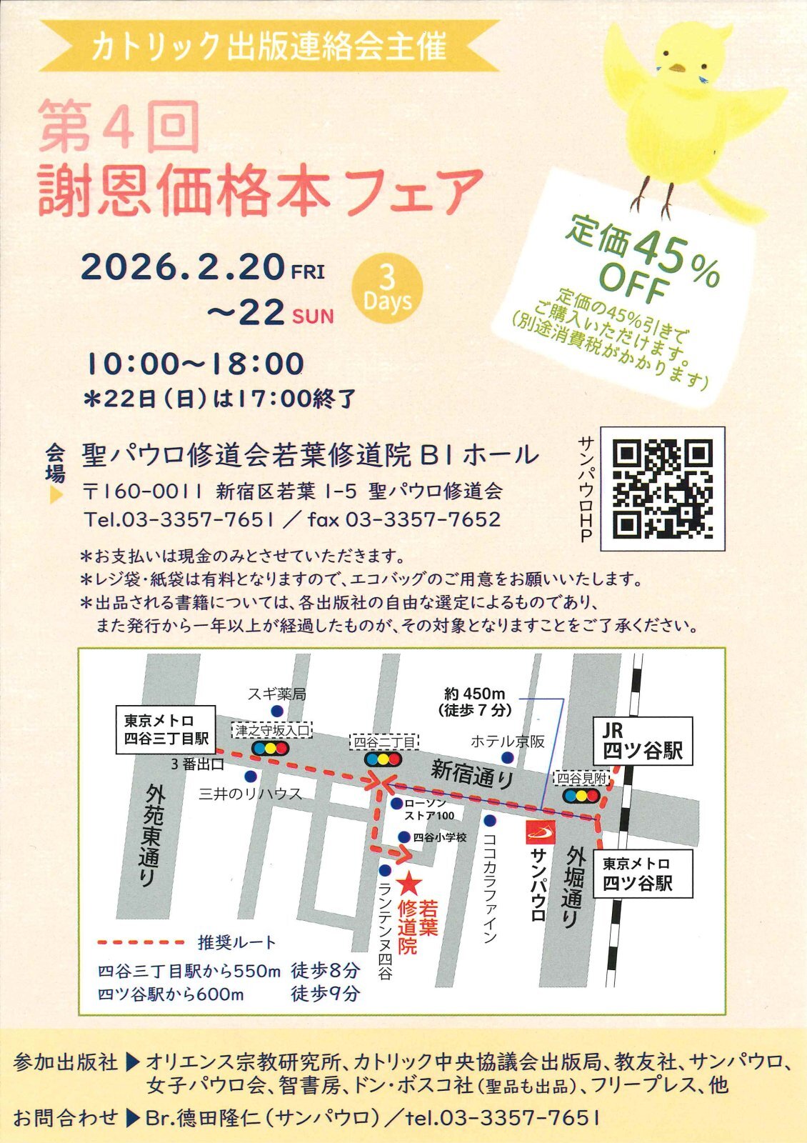 カトリック出版連絡会主催の「第4回 謝恩価格本フェア」が以下のとおり開催されます(入場無料)。