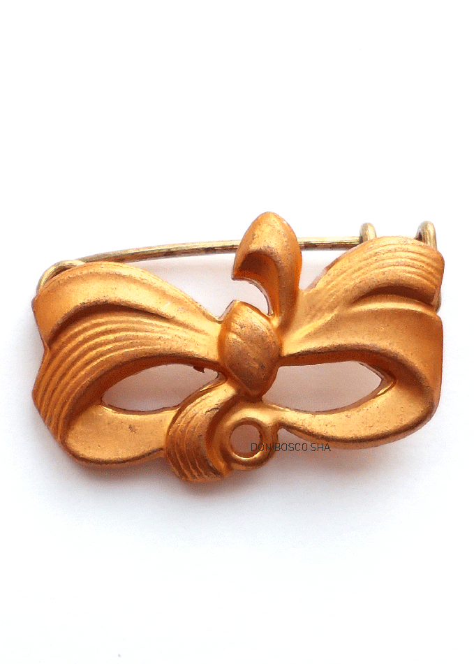 ピンクゴールド色のようなリボン型のピンです。